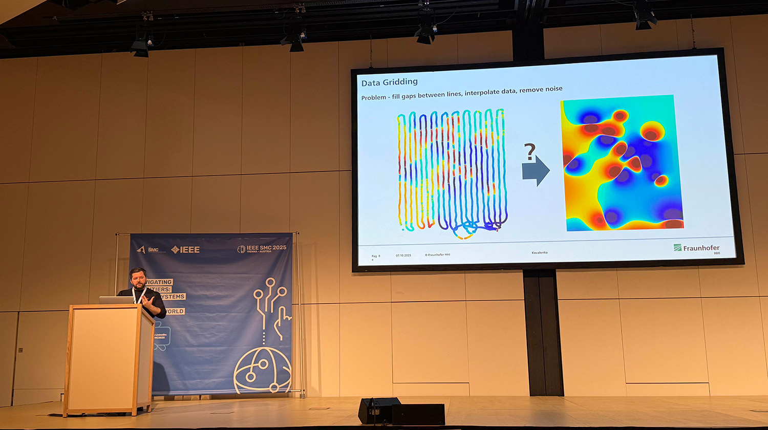 Die im Rahmen von ARES erarbeiten Forschungsergebnisse des Fraunhofer HHI zur KI-gestützten Rekonstruktion magnetischer Felder wurden Anfang Oktober 2025 auf der IEEE International Conference on Systems, Man, and Cybernetics (SMC 2025) in Wien vorgestellt. Dr. Nikita Kovalenko stellte vor, wie magnetische Messdaten – die typischerweise bei der Kampfmittelsondierung mit SENSYS-Magnetometern entstehen – effizienter und zuverlässiger ausgewertet werden können. Die Auswerteverfahren ergänzen die AR-gestützten Messprozesse im ARES-Projekt, bei denen hochwertige Daten und schnelle Verarbeitung entscheidend sind.